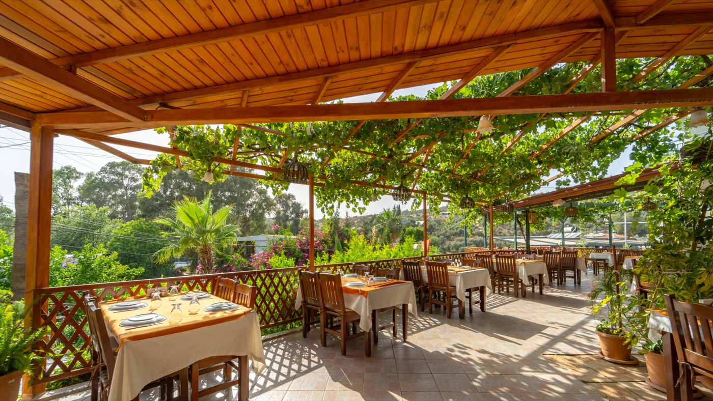 Nach dem Strand kommen viele Gäste auf die Terrasse unter den Weinreben, wo Meze, Güveç und Grillgerichte mit der kühleren Abendluft von Patara serviert werden.